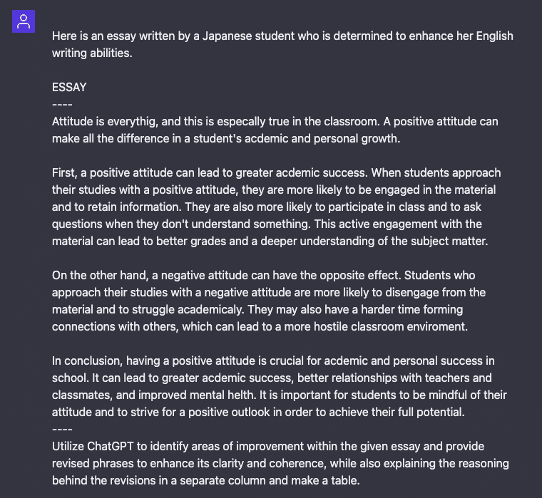 最初のステップは、改善したいエッセイを提供することです。今回は、英語のライティングスキルを向上させたい日本人の生徒が書いたエッセイを使用します。このエッセイは学校での正しい態度について書かれています。点線の間に自分の書いたエッセイをペースト、点線の後に、ChatGPTにエッセイを修正するようにお願いしましょう。ステップ1を実行するには、以下のようにChatGPTにお願いしましょう。