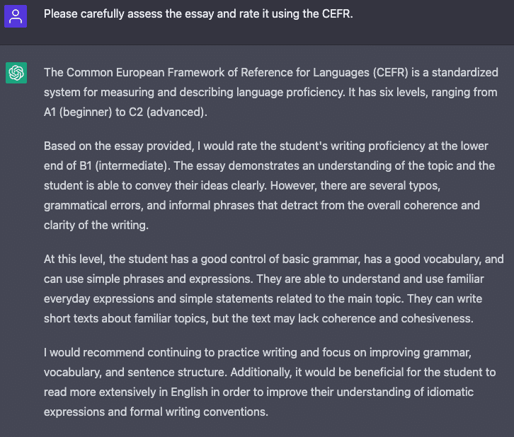次のステップは、エッセイを慎重に評価し、CEFRを使用して評価することです。ヨーロッパ言語共通参照枠(CEFR)は、言語能力を評価するための標準的なシステムです。これによって、教師は生徒の作文能力を評価し、向上させることができます。ステップ4を実行するには、以下のようにChatGPTにお願いしましょう。