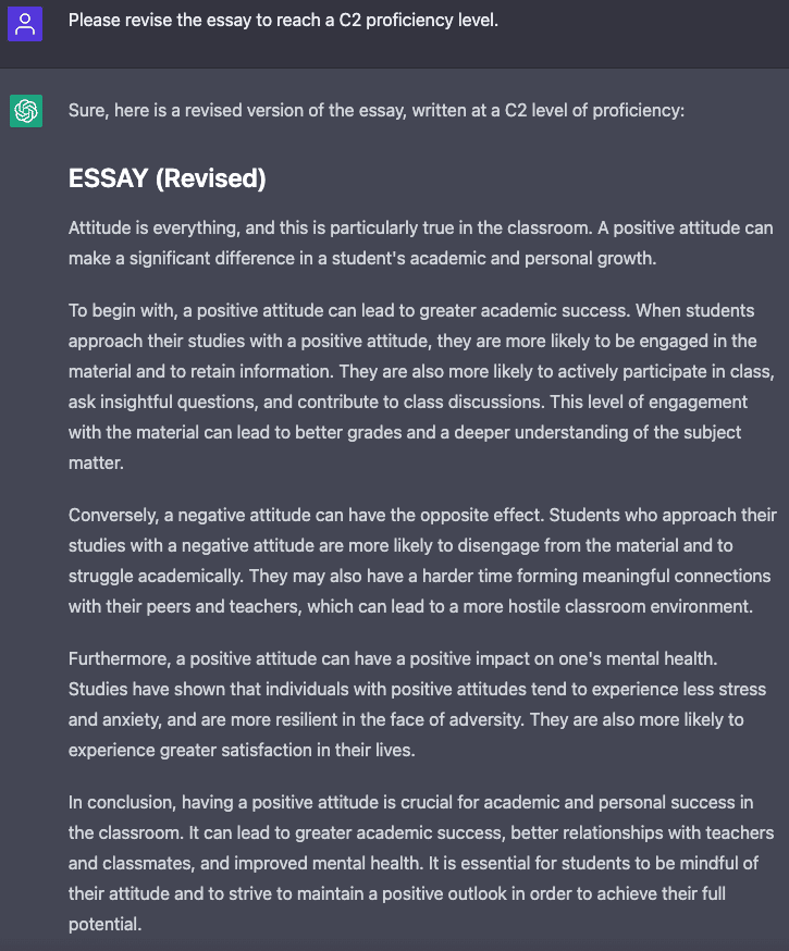最後のステップは仕上げの文章を書いてもらうことです。CEFRの最高レベルでChatGPTに書いてもらえるようにお願いしましょう。ステップ5を実行するには、以下のようにChatGPTにお願いしましょう。