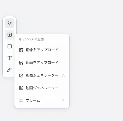 このメニューには、静的な「画像のアップロード」や「動画のアップロード」だけでなく、「画像ジェネレーター」や「動画ジェネレーター」といったAI生成モジュールを起動するオプションが含まれており、あらゆるデザイン作業の起点となります。