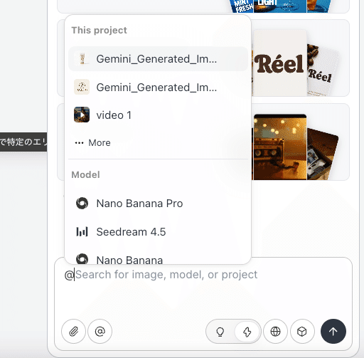 入力に加えて、@記号を用いることで、特定のAIモデルや既存のプロジェクト、画像を直接呼び出すことが可能です。