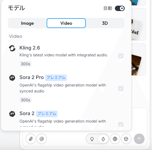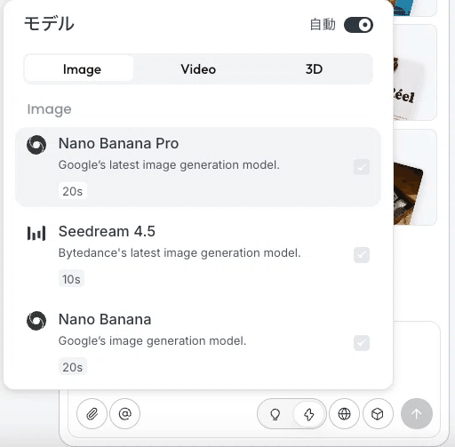「モデル」設定パネルから、これらのモデルを一覧で確認し、それぞれの特徴や生成時間の目安を比較検討した上で、ワンクリックで切り替えることができます。