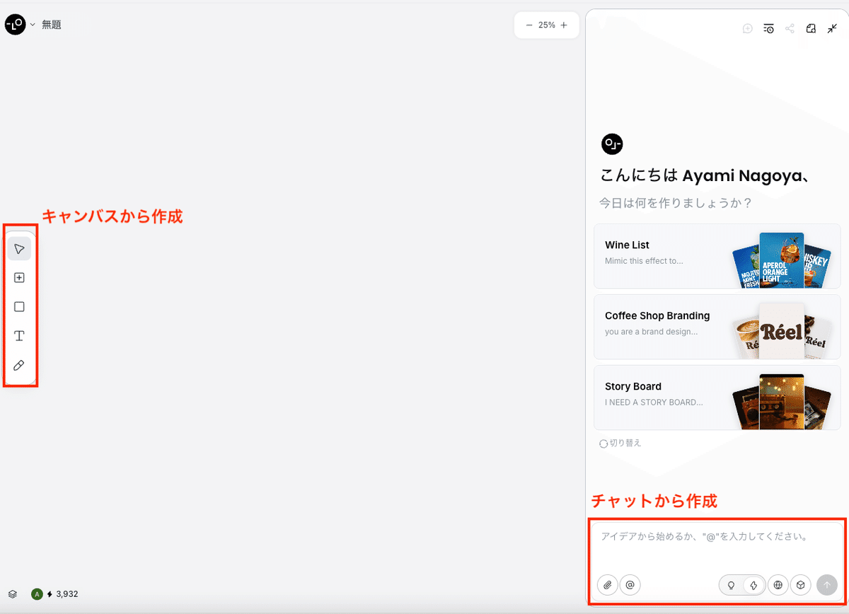 チャットを通じて作成したいデザインのアイデアを伝えるだけで、AIがそれを解釈し生成してくれます。