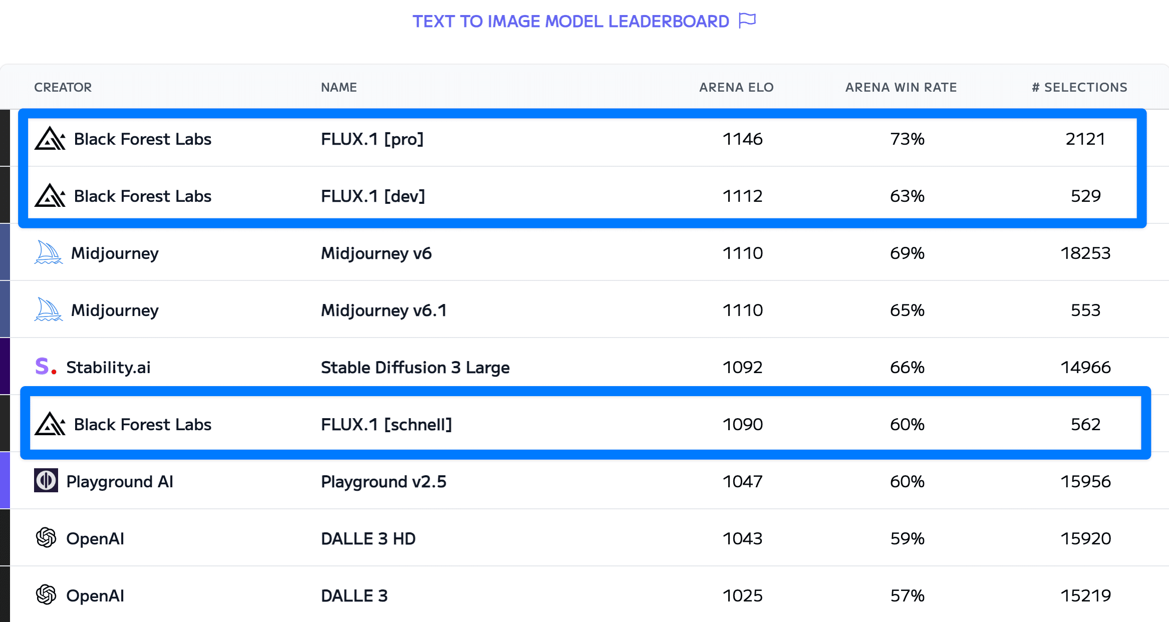 Fluxは、Artificial Analysis Text to Image Model Leaderboardというランキングサイトにおいて、これまで一位だったMidjourneyを抜き、見事一位を獲得しました。