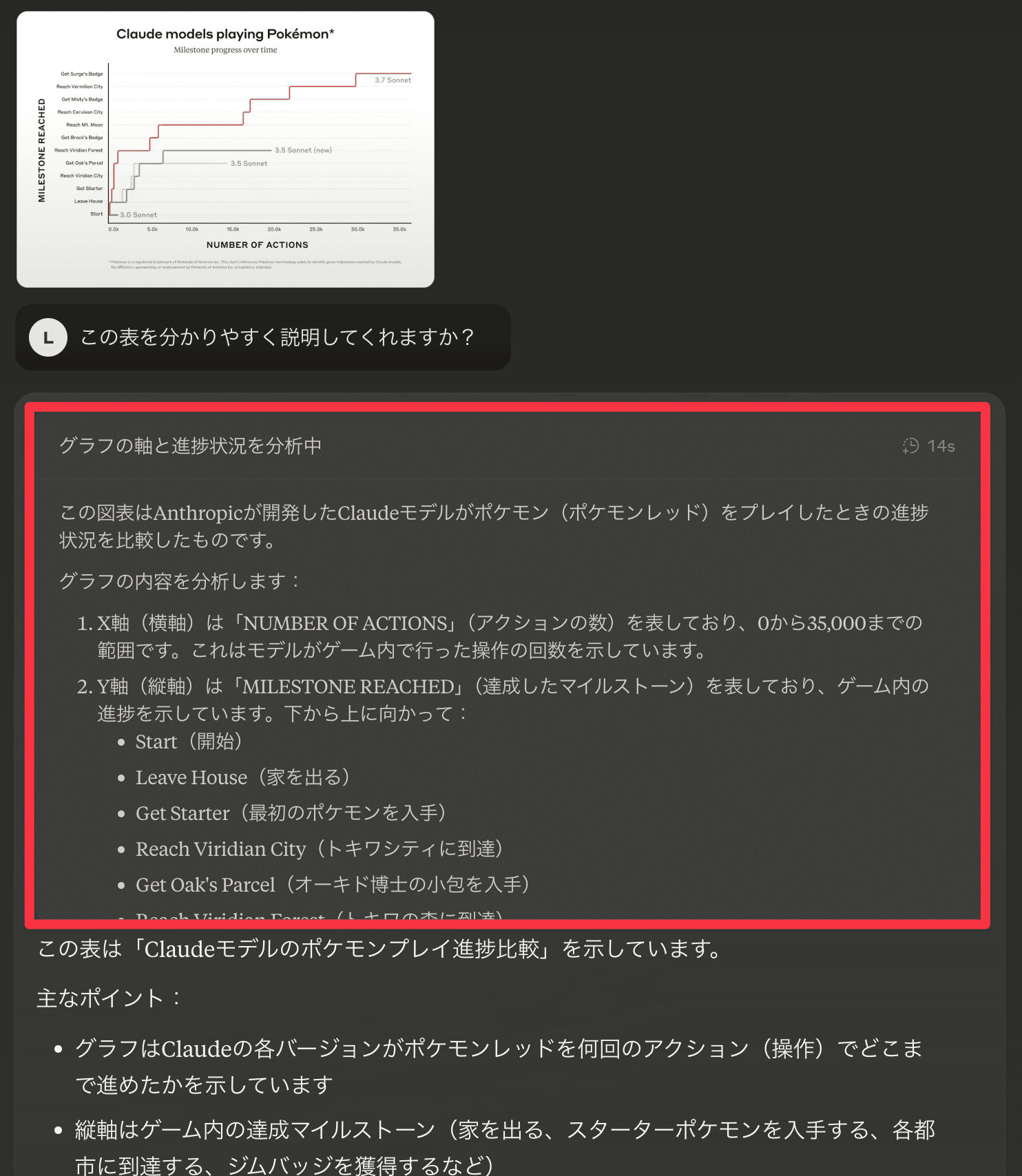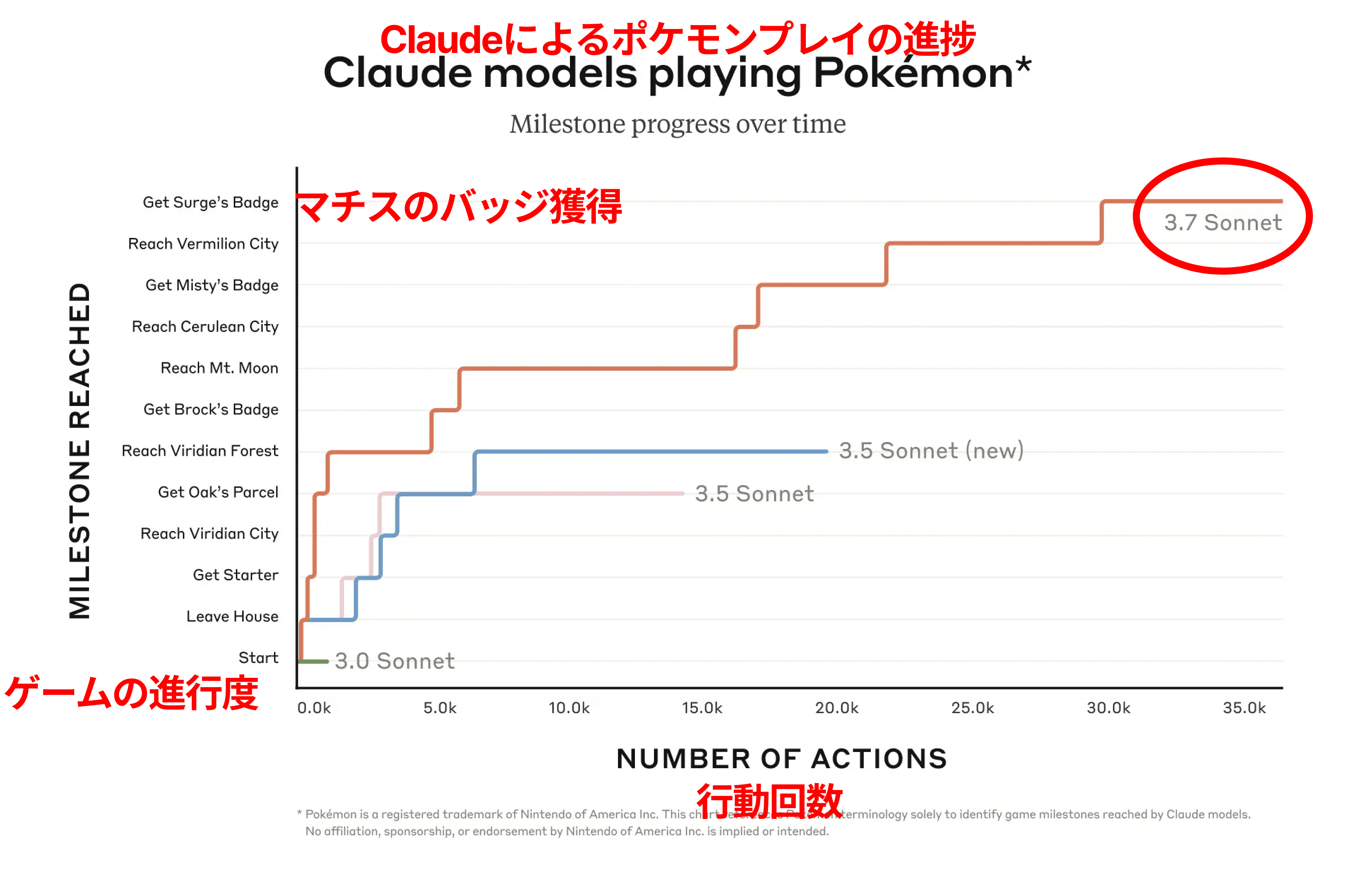 Claude 3.7 Sonnetは、画面入力(ピクセル情報)を受け取りながら数万回以上のアクションを連続実行し、ジムリーダー3人を突破するなど、以前のバージョンが到達できなかった領域に進むことに成功したと報告されています。