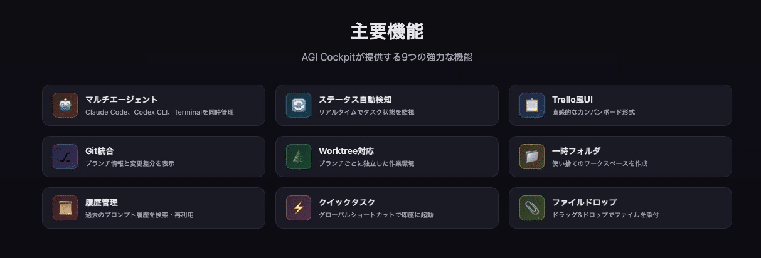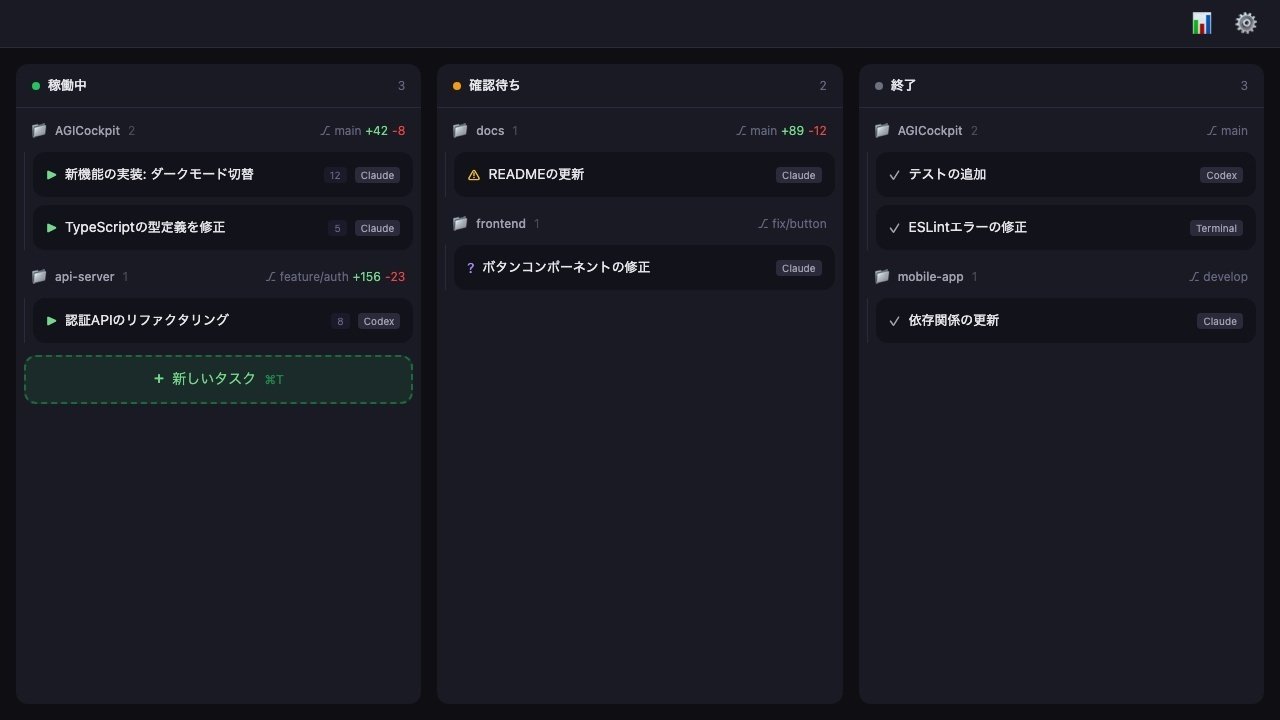 AGI Cockpitは、AIエージェント並列作業環境です。