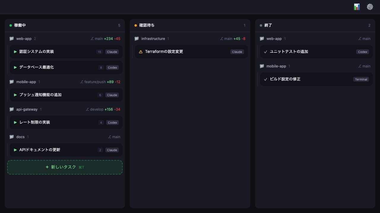 従来のターミナルとは全く異なる発想で、複数のClaude Code / Codex CLI / ターミナルタスクを1画面で統合管理します。