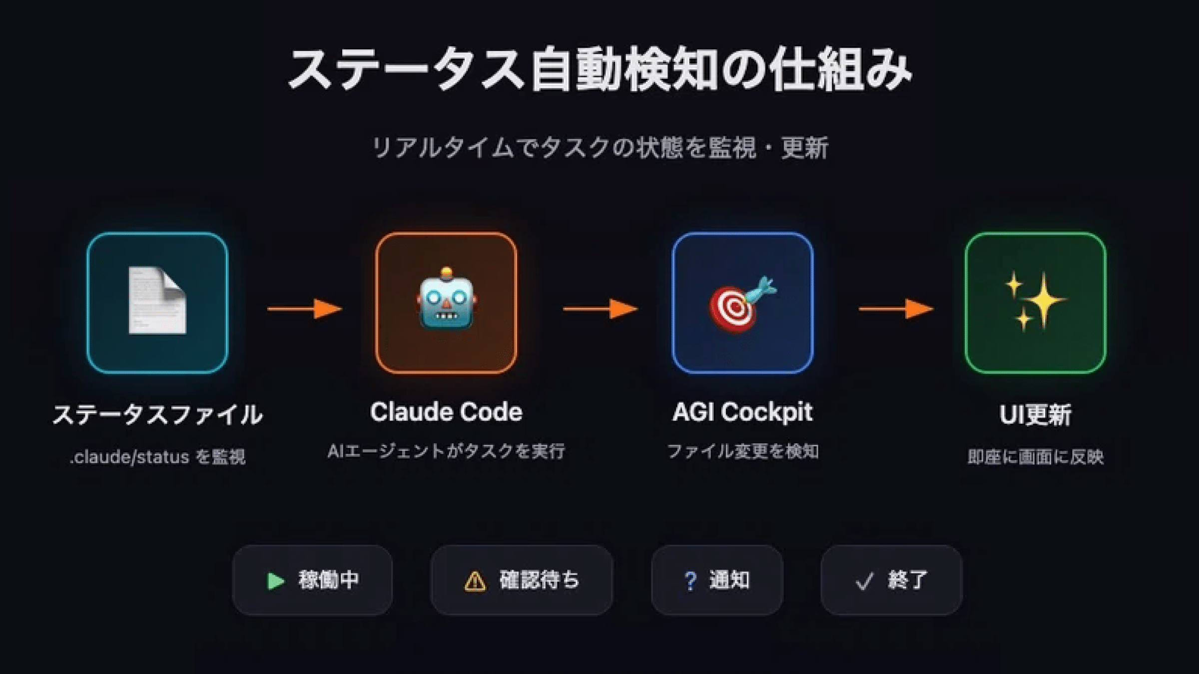 AGI CockpitはClaude Codeのhooks機能やCodex CLIのタスク完了通知と連携し、タスクのステータスをリアルタイムで自動検知します。
