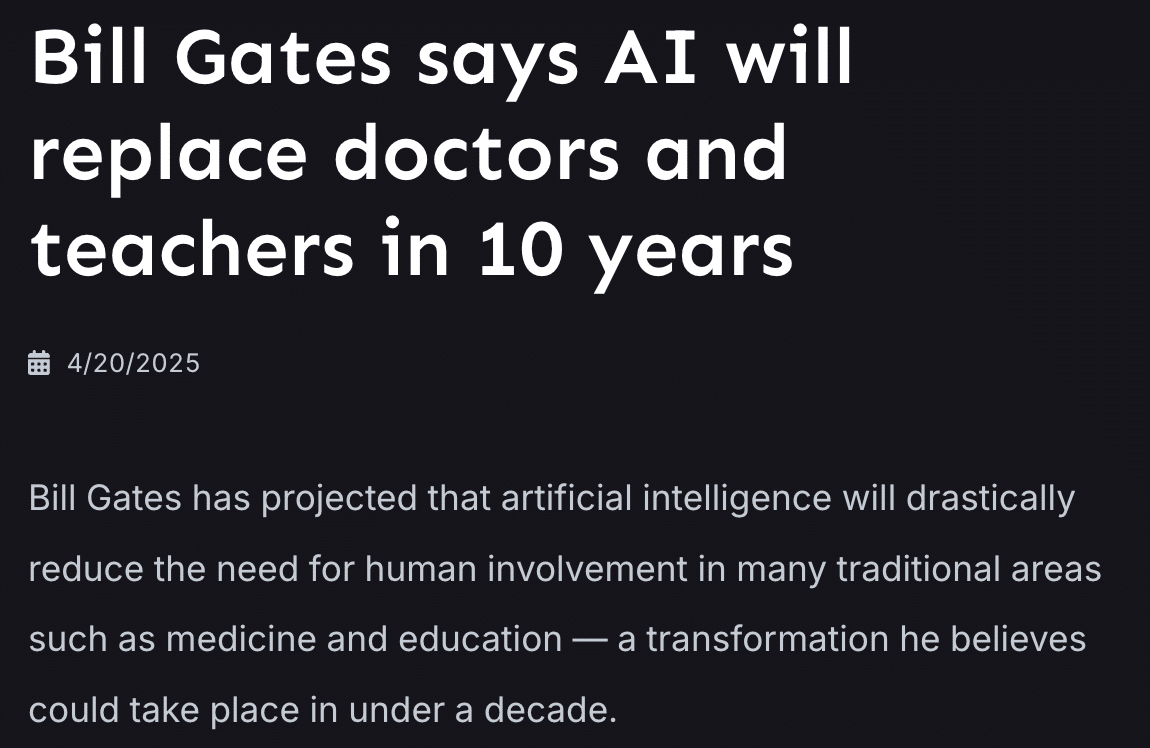 10年以内の代替予測: ビル・ゲイツ氏が、AIが10年以内に医師や教師の多くを不要にする可能性を指摘。