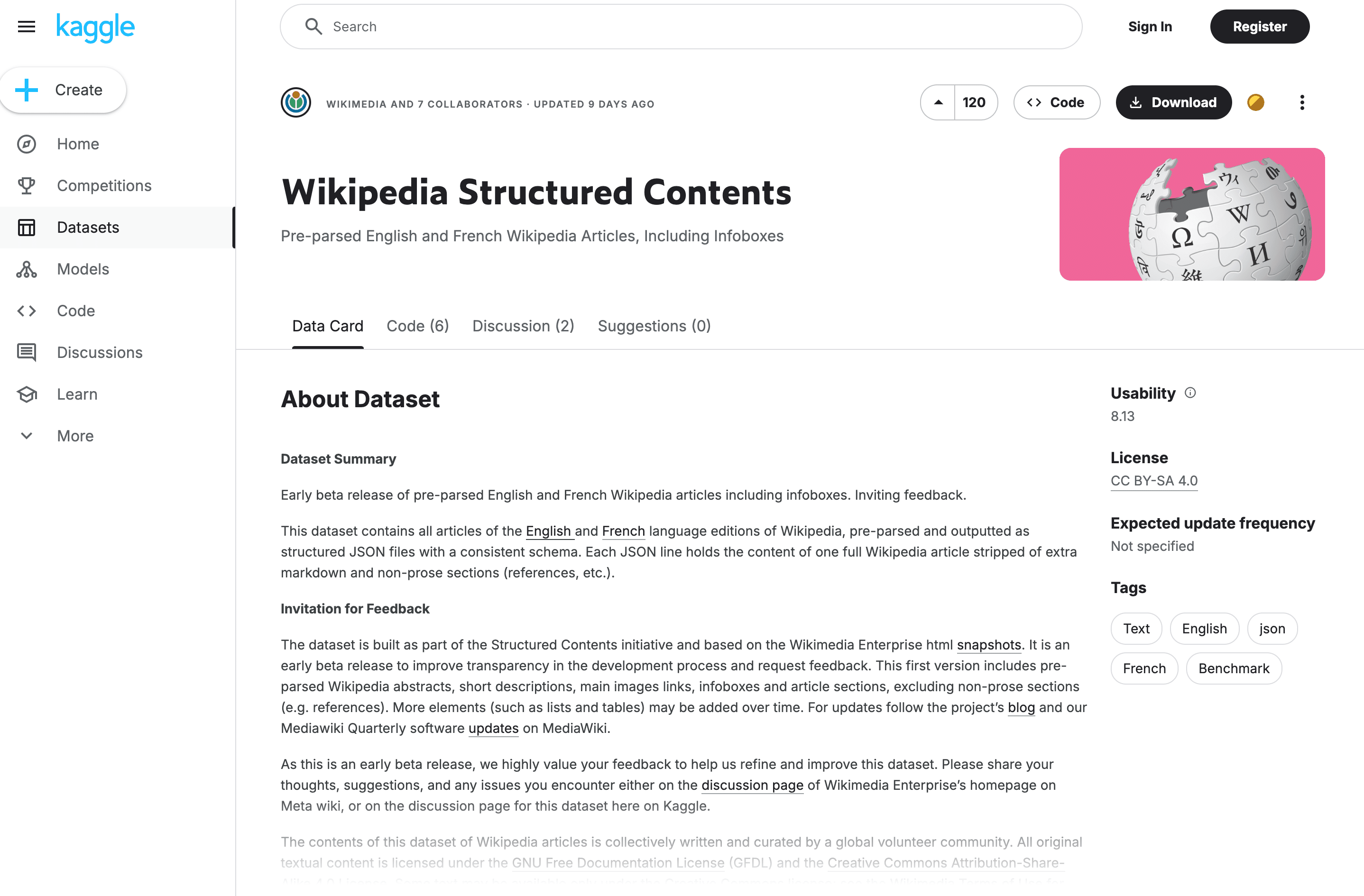 Kaggleでデータセット公開: Wikimediaが構造化されたWikipediaデータセット(英・仏語)をKaggleでベータ公開。
