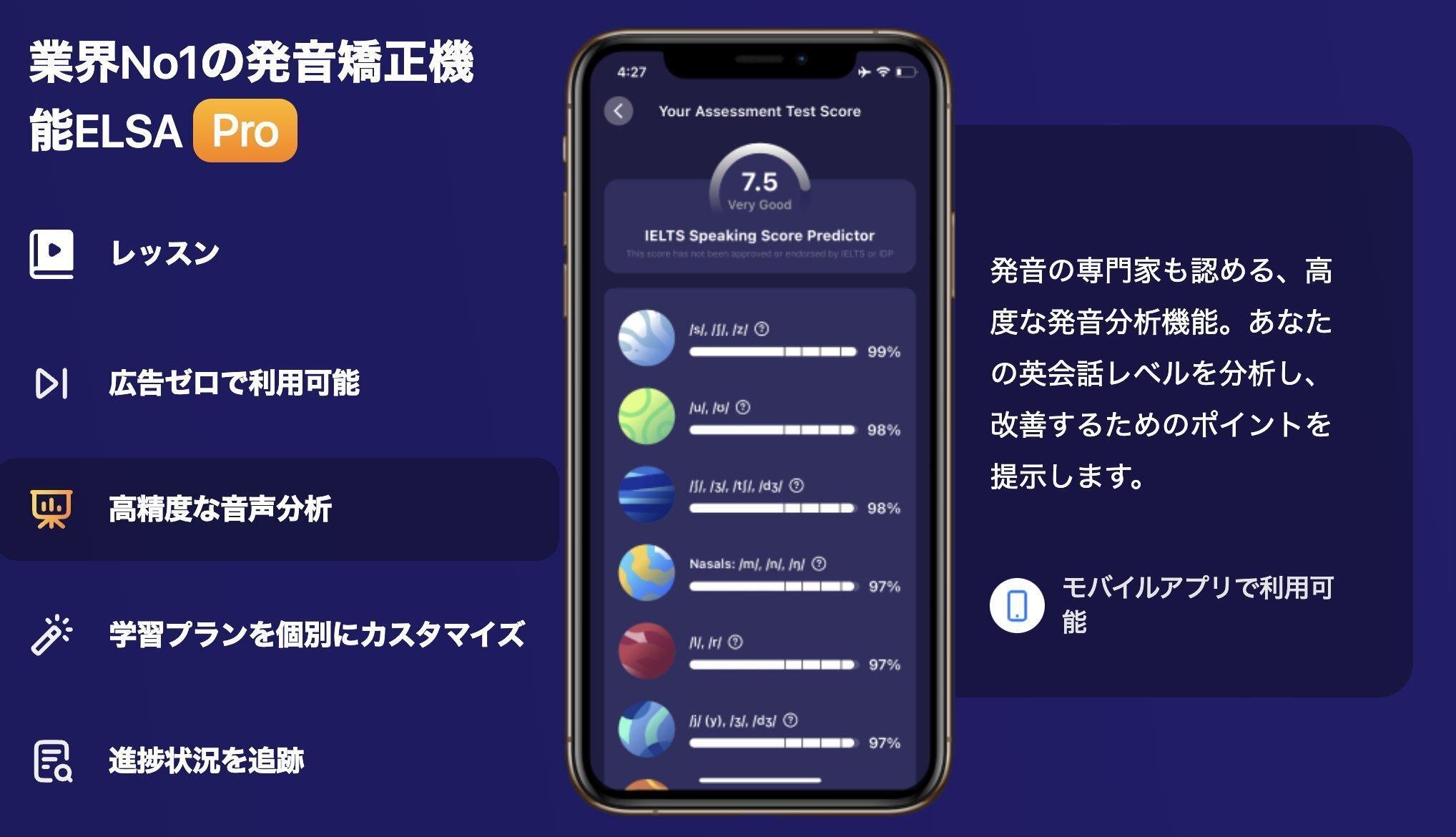 ELSA AIのプレミアムプランには、高精度の音声分析機能があり、発音に関する正確なフィードバックを受けることができます。