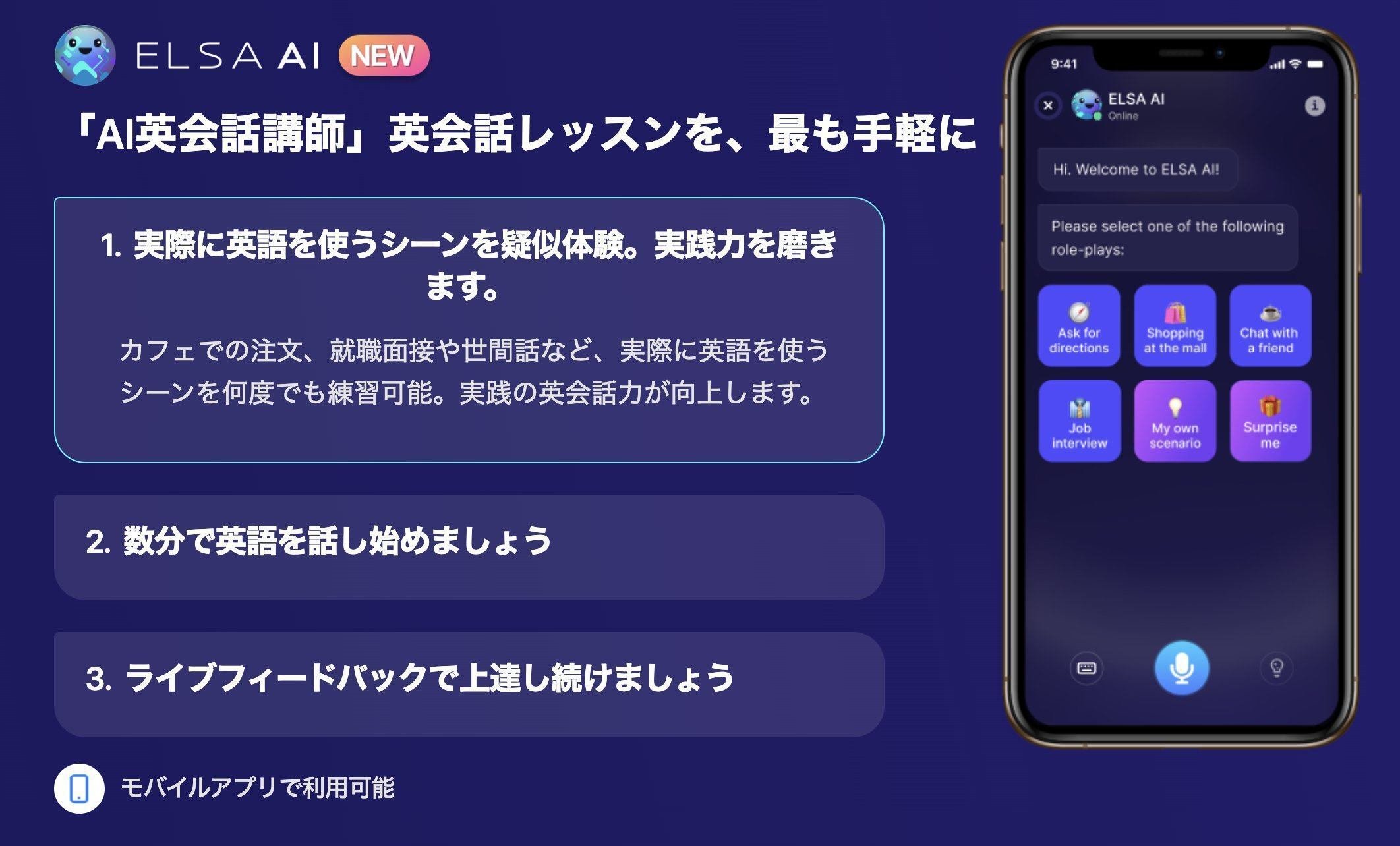 また、英会話のスキルは、言語習得において最も重要な要素の一つです。ELSA AIのプレミアムプランでは、リアルな英会話の設定をシミュレートできるAI英会話機能を導入しています。この機能により、リアルなシナリオを反映した対話ができ、実践的な会話に対応できるようになります。また、モバイルアプリを使っていつでもすぐに練習することができます。この機能の特徴は、フィードバックが即座に提供されることで、間違いを即座に修正し、会話力に磨きをかけることができます。