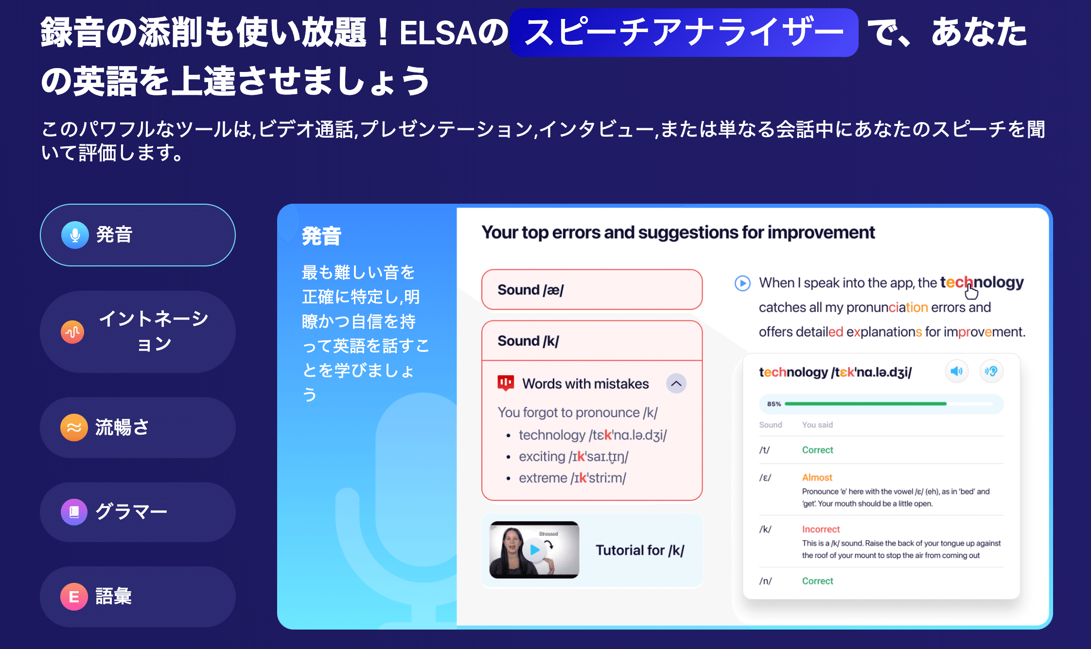 そして注目は、ELSA AIの「スピーチアナライザー」。この機能は、ユーザーを総合的に評価し、次のような点にまで踏み込みます: