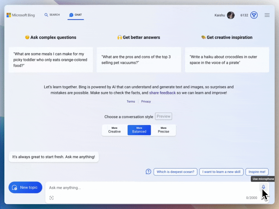 マイクロソフトは最近、デスクトップでの音声チャットを導入し、Bingの機能を強化しました。Bing のマイクアイコンをタップするだけで、AIを搭載したボットと音声で会話することができます。これは実際の会話をシミュレートするだけでなく、チャットボットが返事を音声で読み上げるため、よりリアルタイムに近い学習体験も提供してくれます。現在、Bing Chatは英語、日本語、フランス語、ドイツ語、北京語を含む多言語をサポートしており、今後対応言語を拡大する予定です。この音声機能により、リアルなシチュエーションに近い練習が可能になり、話すことと聞くことの両方ができるようになるため、総合的な言語能力が向上できます。