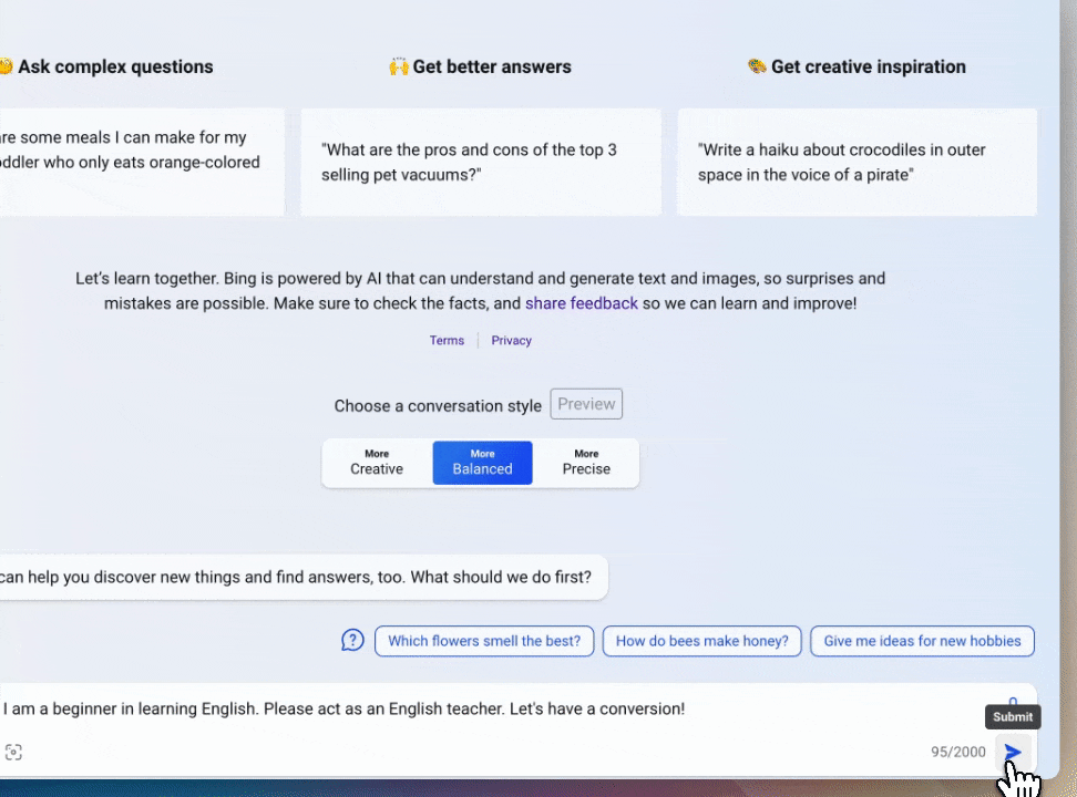 言語学習において難しいことの一つは、実際の会話をシミュレートすることです。Bing AIを使えば、ネイティブスピーカーと会話しているかのような自然な対話をすることができます。リアルタイムのシナリオで語彙や文法まで、より実践的な学習体験が可能になります。