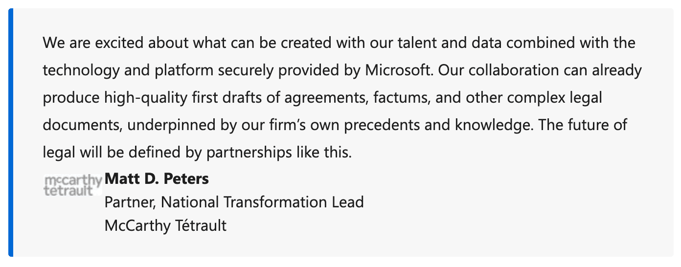 Microsoftが提供する安全なテクノロジーとプラットフォームに、私たちの人材やデータを融合させることで、新たな可能性が生まれることを楽しみにしています。このコラボレーションにより、契約書や陳述書などの複雑な法的文書の高品質な初稿を、自社独自の先例や専門知識を基にすでに作成できています。このようなパートナーシップこそが、法務分野の未来を形作るでしょう。