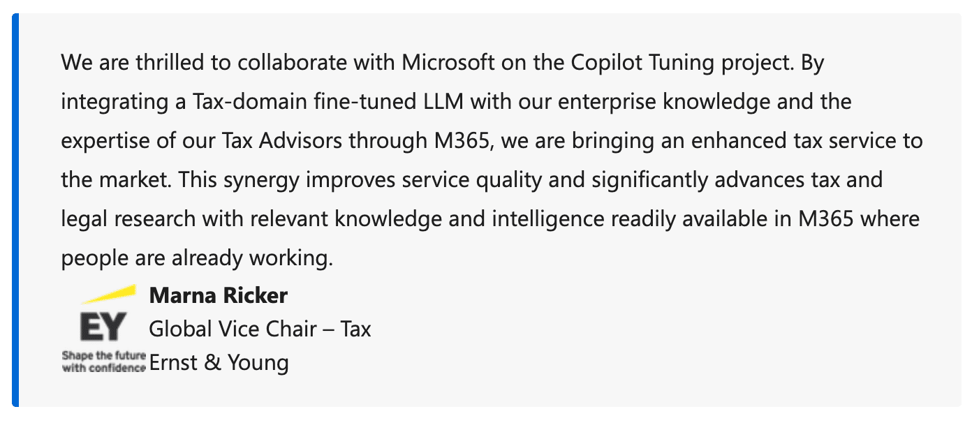 Microsoftと共同でCopilot Tuningプロジェクトに取り組めることを大変嬉しく思います。税務分野に特化してファインチューニングされたLLMを、私たちEYの持つ専門知識や税務アドバイザーのノウハウと統合し、M365を通じて市場に新たな税務サービスを提供します。この相乗効果によりサービス品質が向上するだけでなく、すでに業務の場となっているM365内で、税務・法務分野におけるリサーチを大きく進化させ、関連知識やインテリジェンスを迅速に活用できるようになります。
