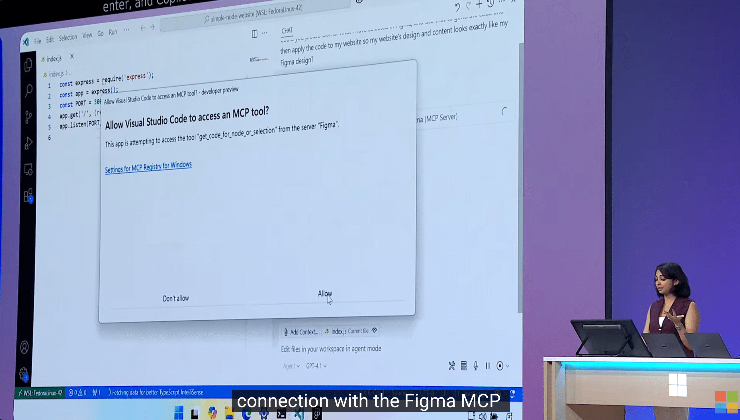 キーノートでは、このMCP連携の具体的なデモとして、GitHub Copilot (エージェントモード) がFigmaのMCPサーバーと連携する様子などが紹介されました。