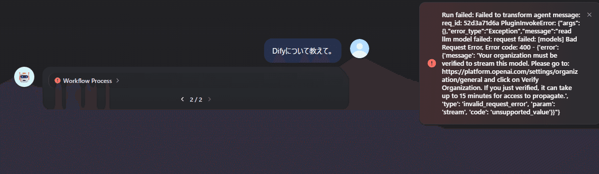 こちらはstreamingレスポンス(一気にではなくだんだん応答メッセージが出てくる方式)をGPT-5で利用するには組織の認証が必要というエラーでした。