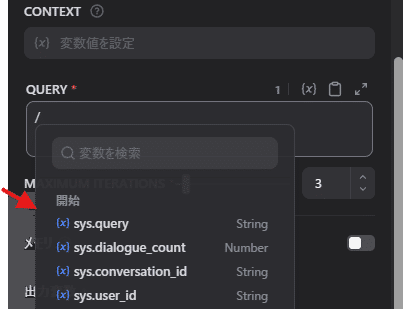 重要なポイントは箇条書きでまとめ、必要に応じて追加の説明を加えてください。次に、queryです。ここに/を入力すると、変数の一覧が出てくるのでその中からsys.queryを追加してください。