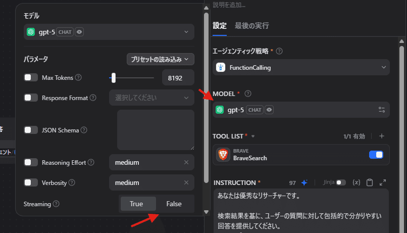 変更の仕方も簡単です。エージェントノードを選択し、MODEL→StreamingをFalseにするだけ。