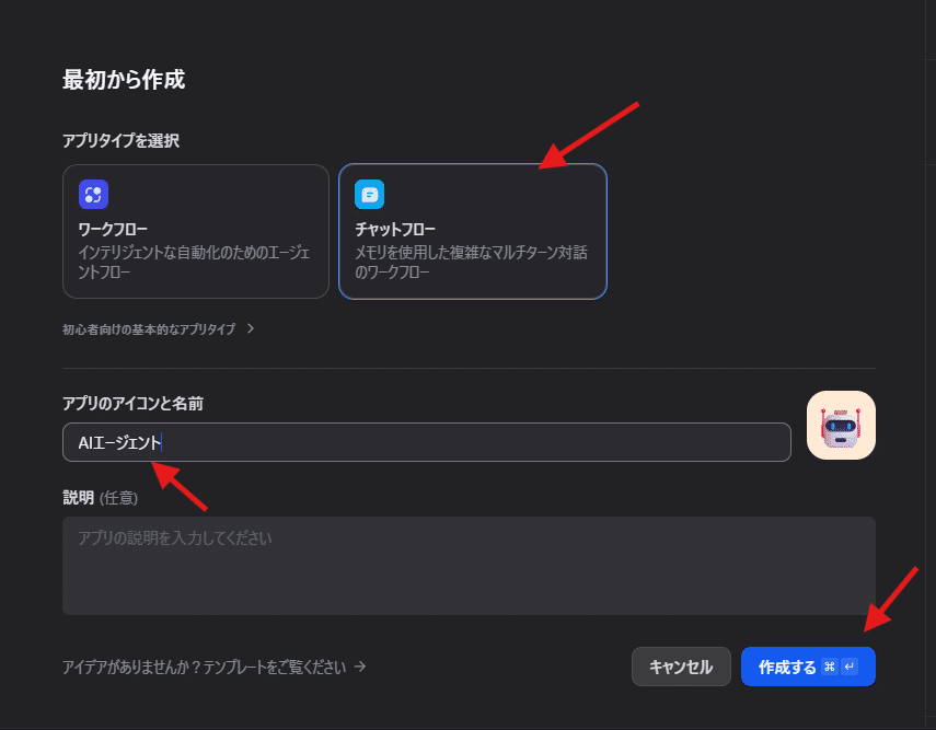 次に、チャットフローを選択し、アプリの名前を入力して作成するを押してください。