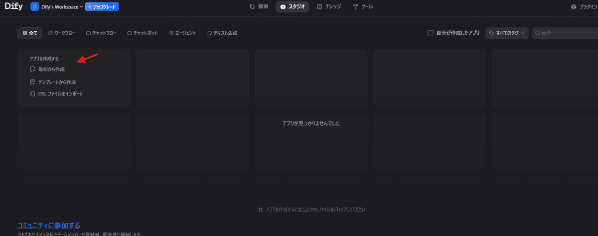 ログインし、スタジオからアプリを作成するの欄の最初から作成を選択してください。