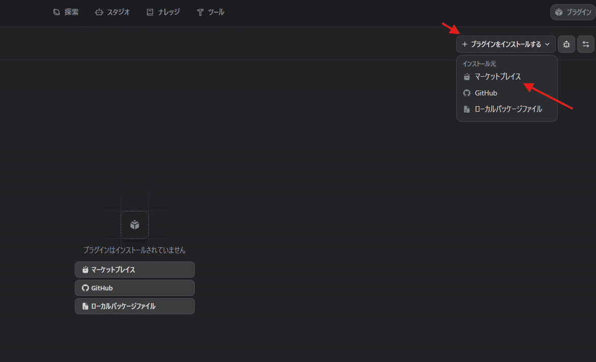 次に、プラグインをインストールするを選択してマーケットプレイスを選択。