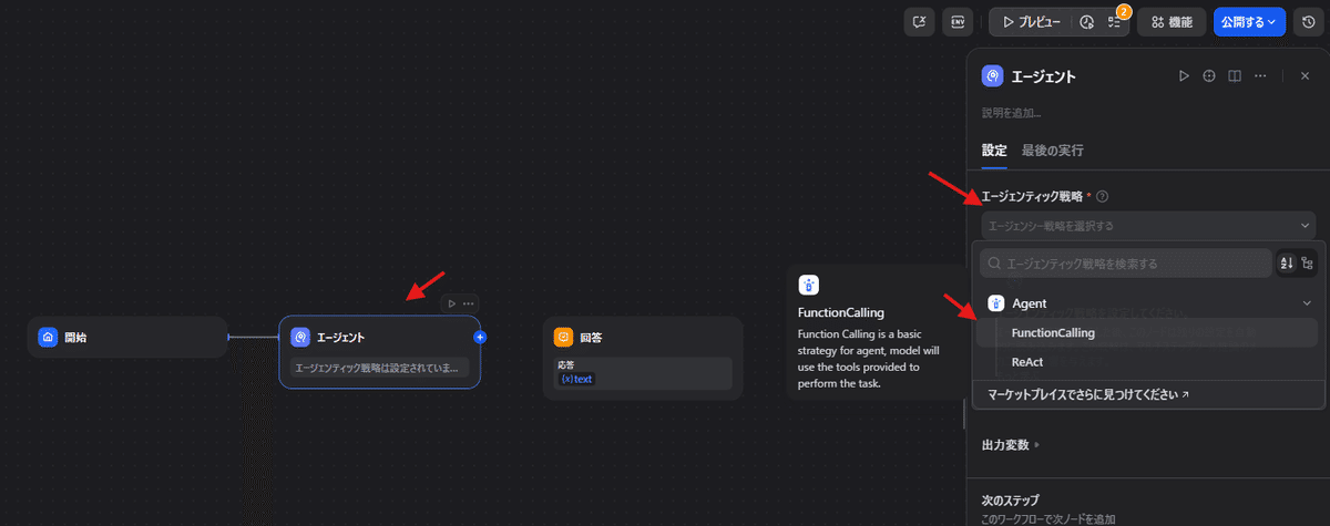 まず、開始→エージェントノードを選択→エージェンティック戦略→FunctionCallingを選択。