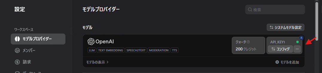 2.「モデルプロバイダー」タブを開き、APIキーのコンフィグで設定
