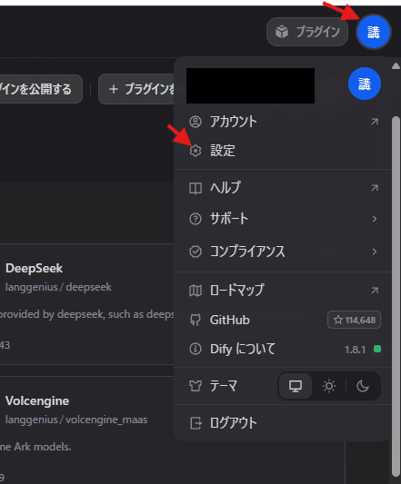 1.Difyの画面右上のプロフィールアイコンから「設定」を選択