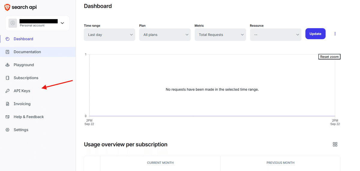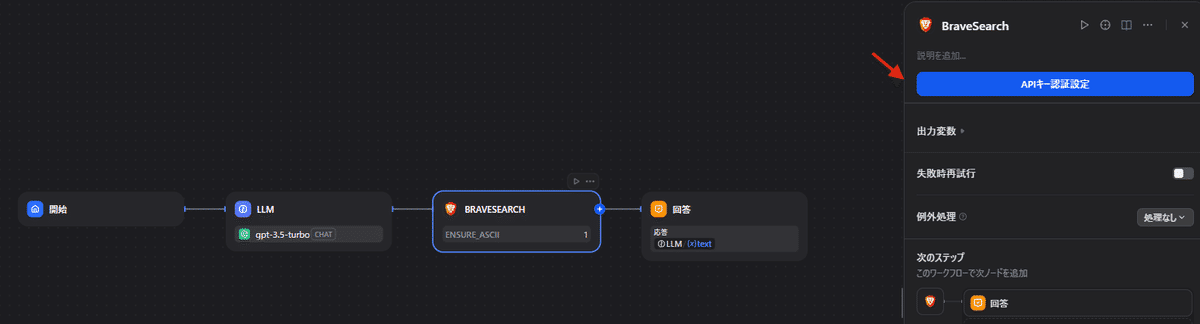 Braveのノードを選択し、API認証設定を選択してAPIキーを入力する。