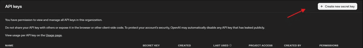 4.Create new secret keyを選択し、名前と関連プロジェクト・権限を選択