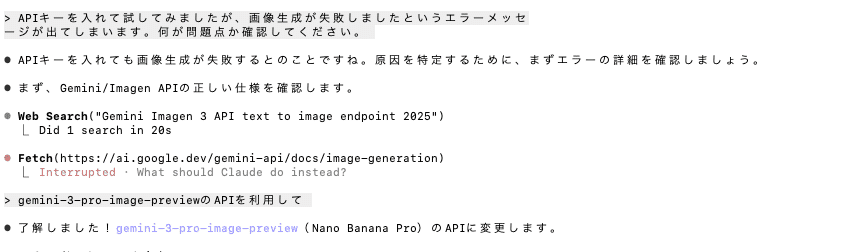 Imagen3のAPIを使用していたので、Nano Banana Proに合わせたコードに修正してもらいました。