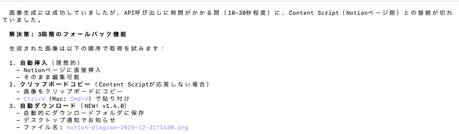 失敗と試行錯誤を経て、Notion上で画像を生成できる拡張が完成しました。