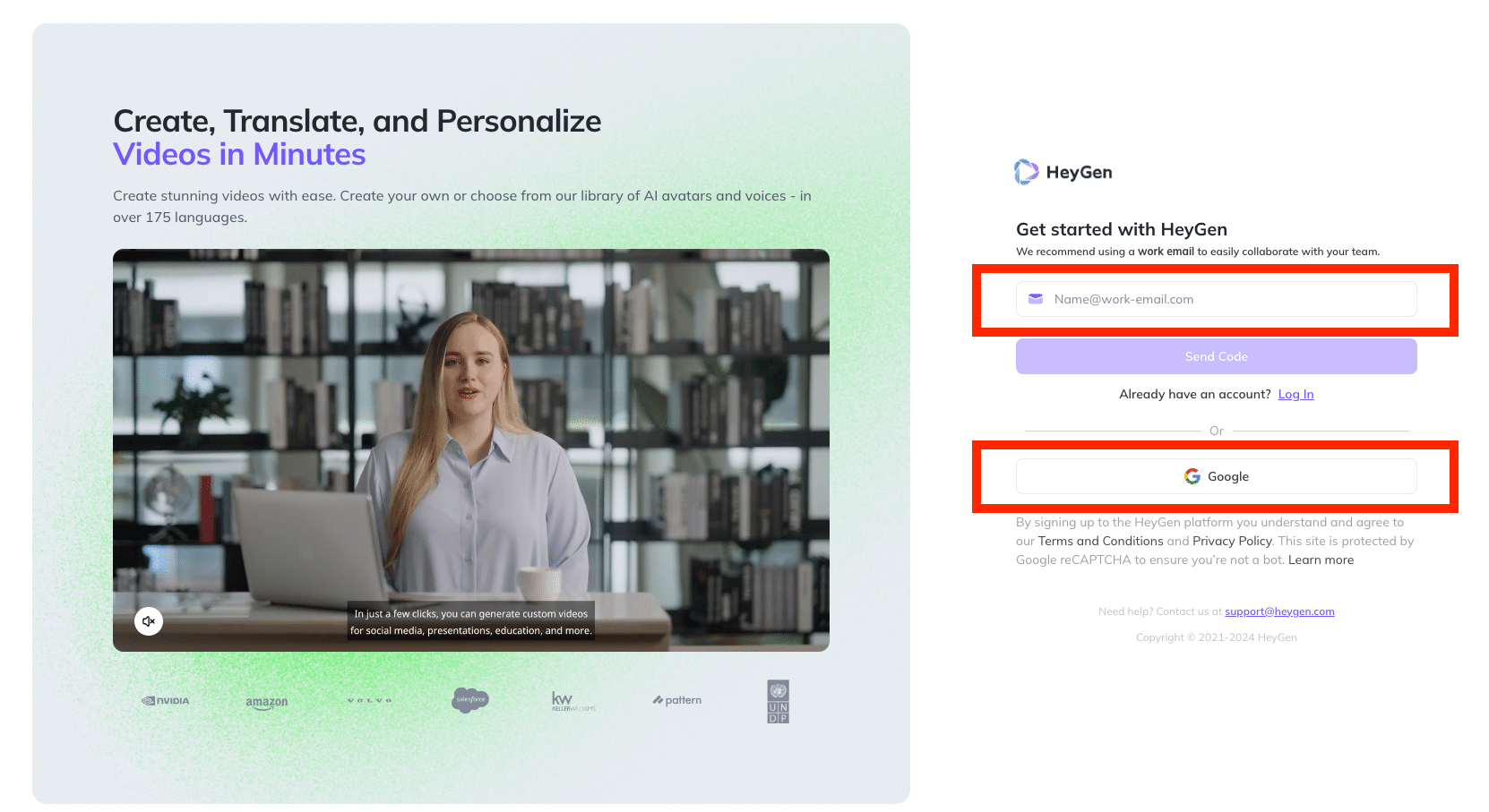 まずは、HeyGenの公式サイトにアクセスし、アカウントを作成しましょう。メールアドレス、またはGoogleアカウントを使って登録することができます。