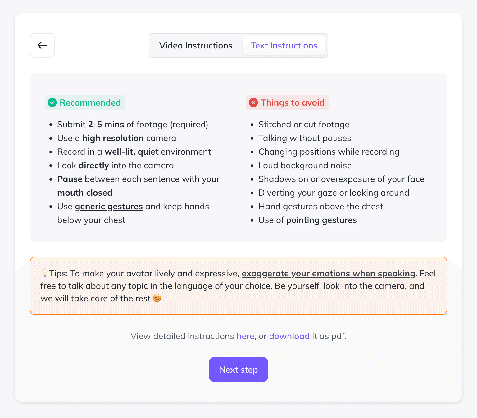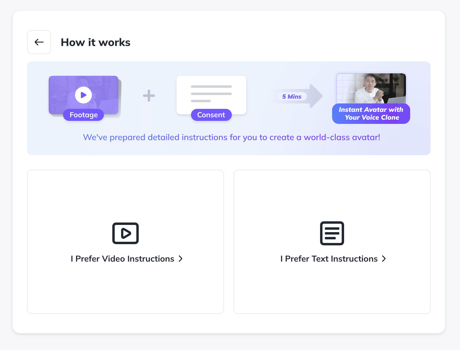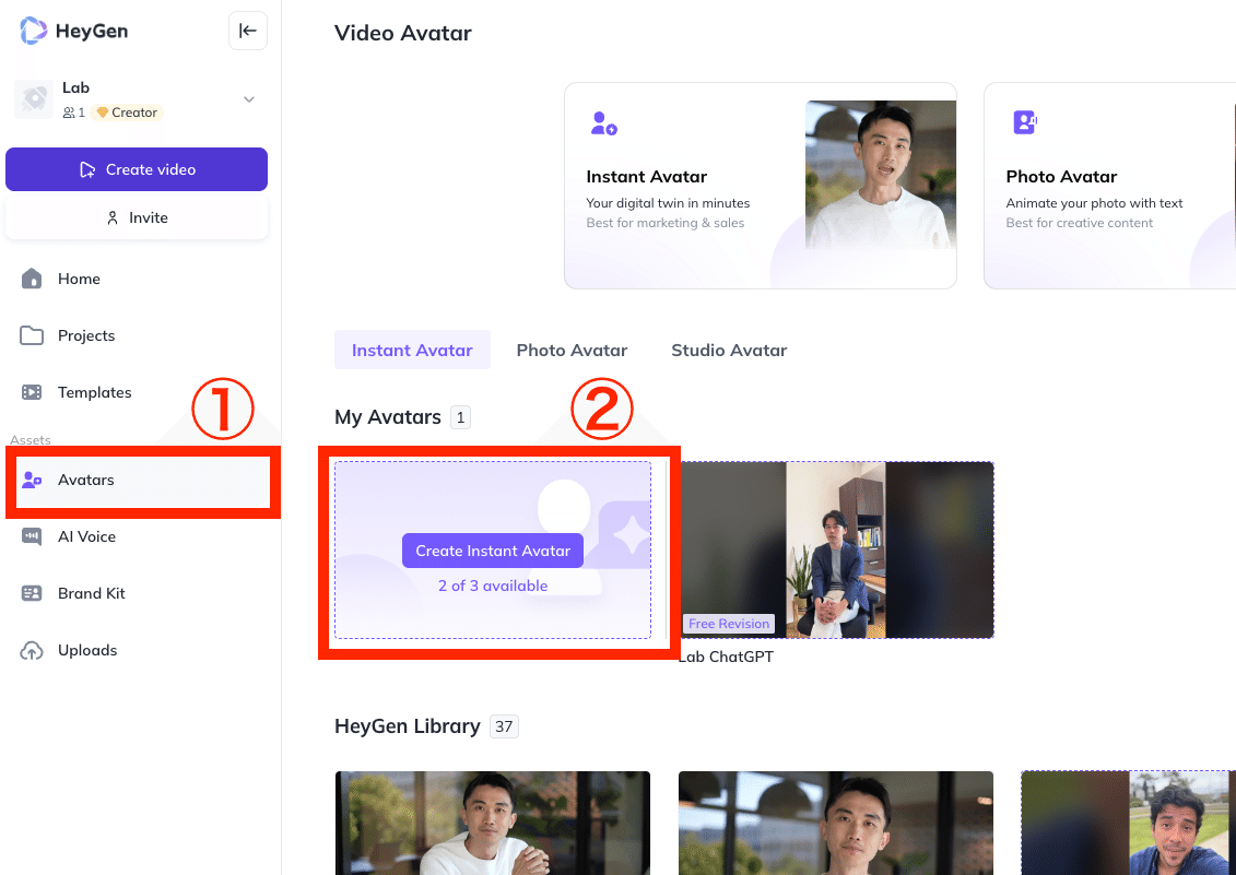 ダッシュボード左側のメニューから「Avatars」を選択し、「Create Instant Avatar」を選択します。
