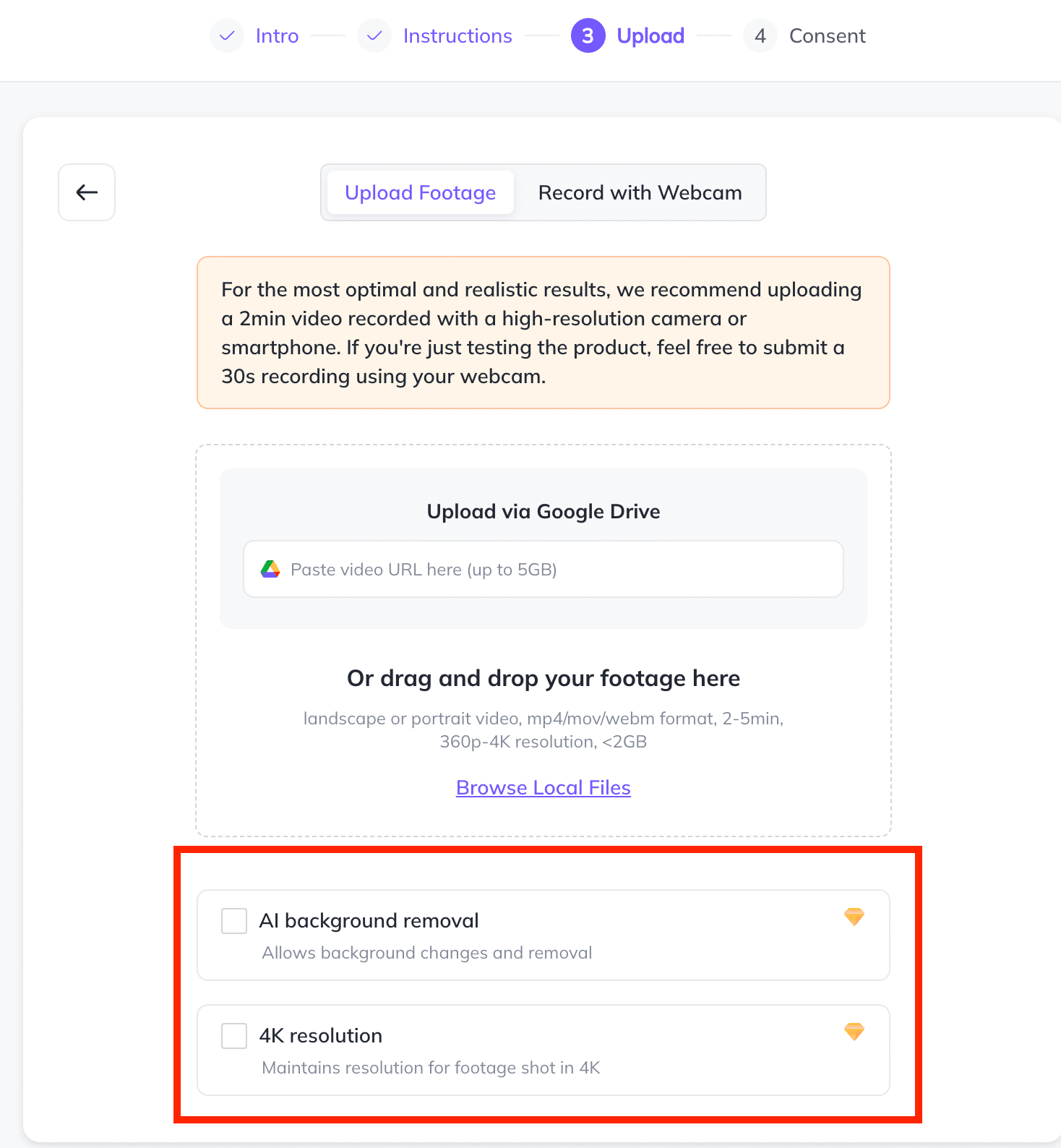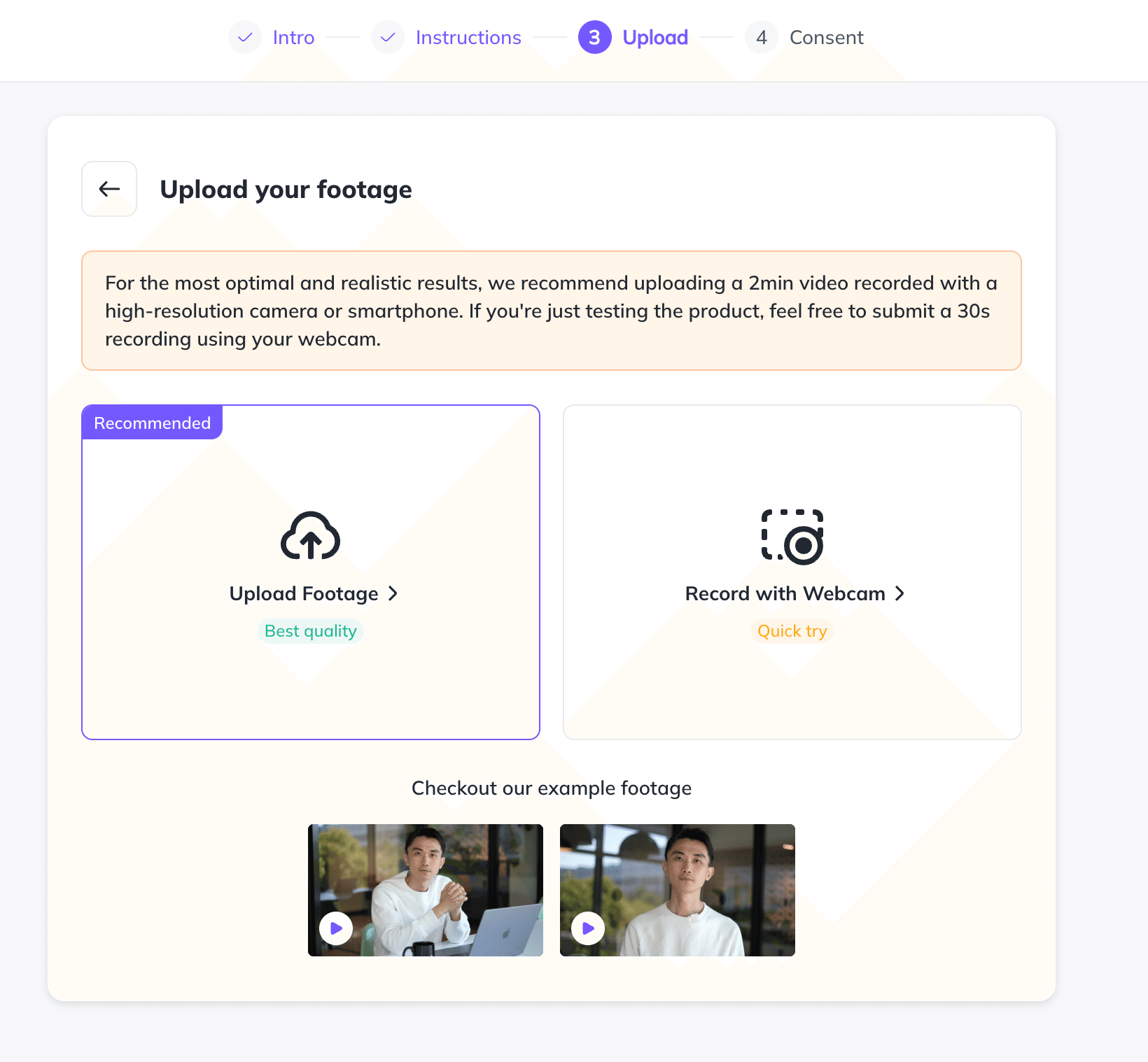 次は、録画した動画のアップロード、またはウェブカメラでの撮影を選択します。