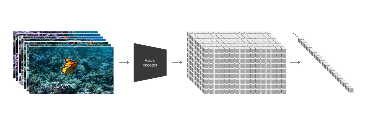 Soraは、画像や動画を低次元潜在空間に圧縮し、それを小さなパッチに分割します。