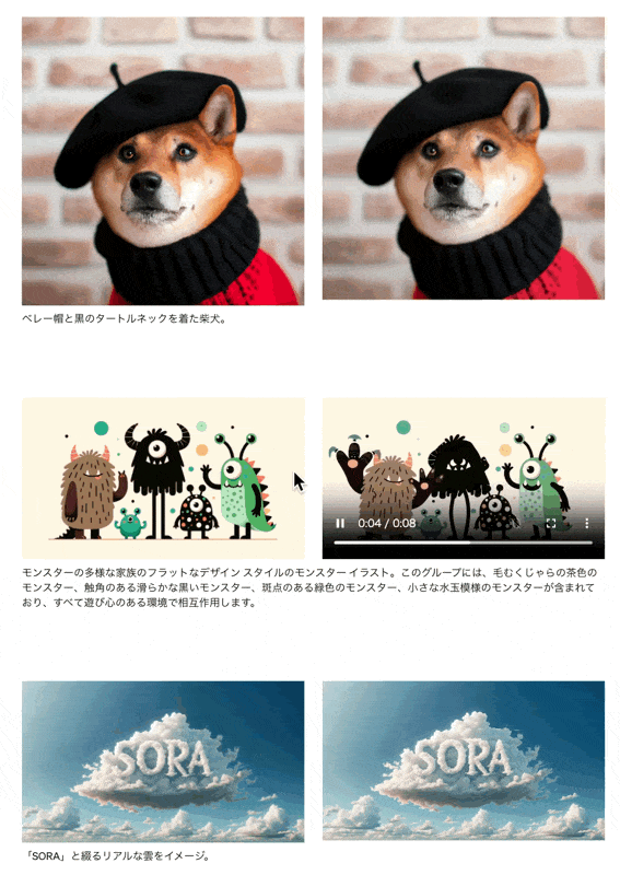 Soraは、画像とプロンプトの入力をもとに動画を生成できます。この機能により、Soraは、以下のような幅広い画像およびビデオ編集タスクを実行できるようになります。
