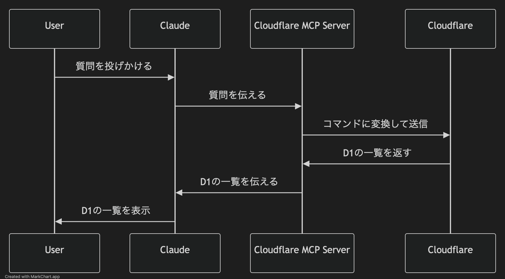 Cloudflare MCP Serverは、Claudeからの自然言語の指示を、Cloudflareのサービスが理解できるコマンドに変換し、その結果をClaudeに返します。