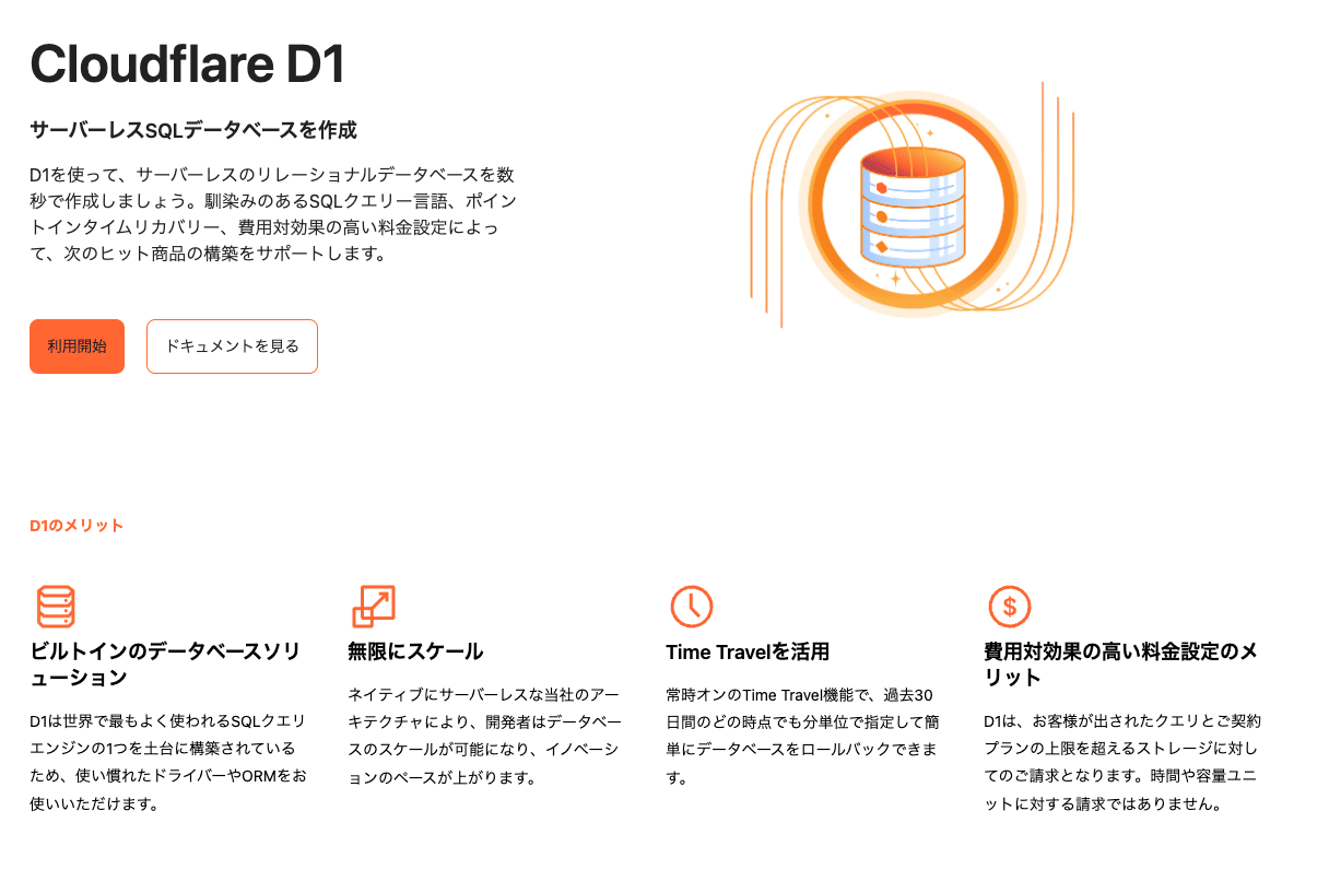 D1は、Webアプリケーションで使用するデータベースを簡単に作成・管理できるサービスです。SQLというデータベース操作言語を使って、データの保存や取得ができます。サーバーレスで動作するため、データベースサーバーの管理は不要です。