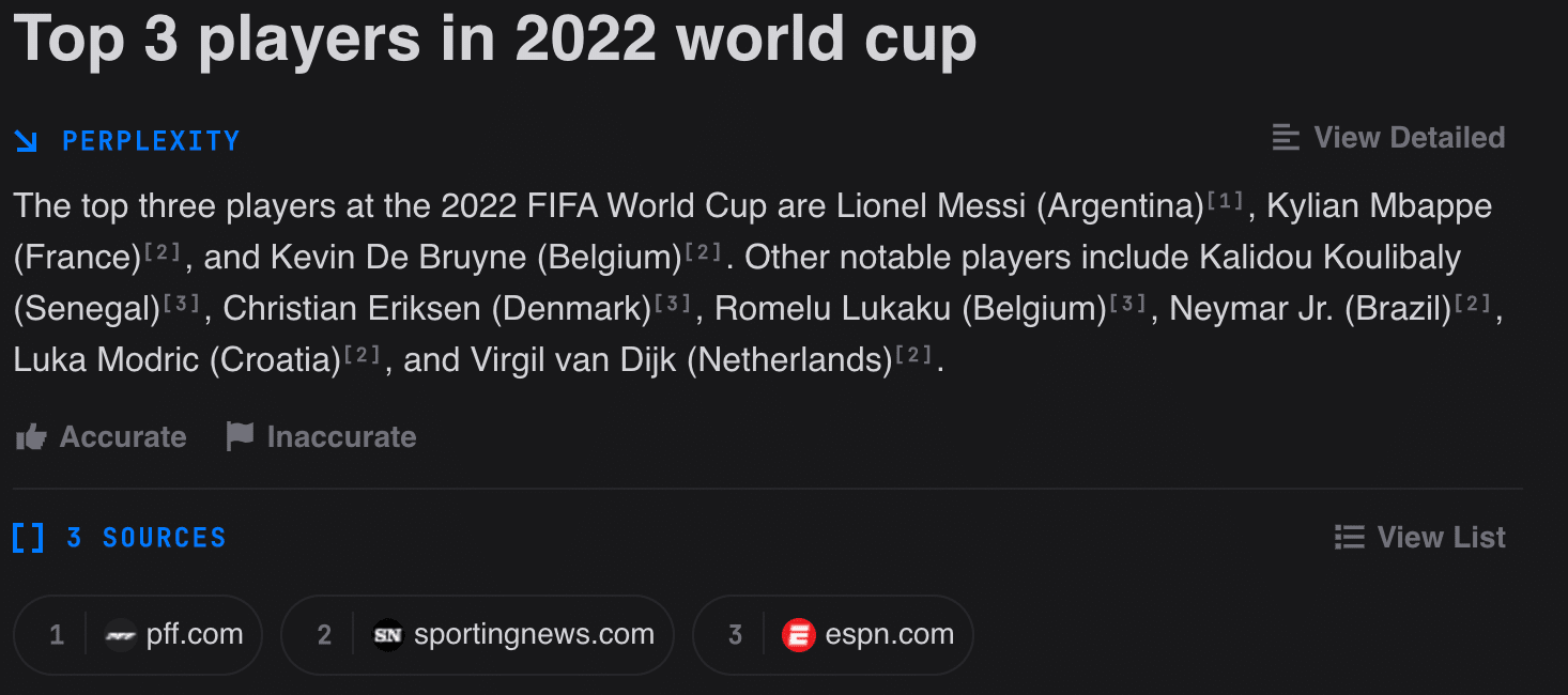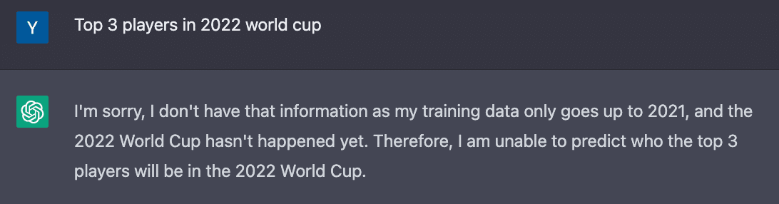 ChatGPT, Perplexity Ask に2022ワールドカップの特筆すべき三人の選手を聞いてみました。Perplexity Ask は メッシ、エムバペ、ケヴィン・デ・ブライネとの回答。概ねあっています。ChatGPT は、情報がない、との回答。