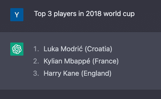 ChatGPT はモドリッチ、エムバペ、ハリー・ケインとの回答。