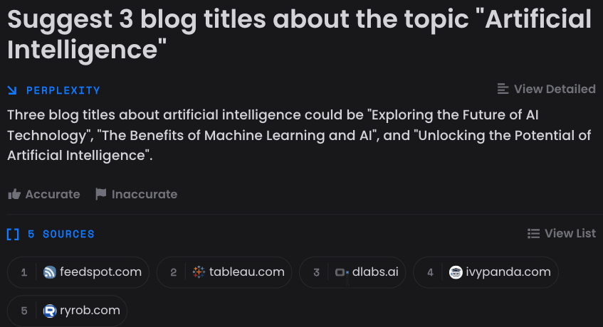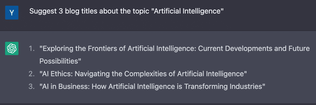 Perplexity Ask は基本的には検索に特化しているため言語生成タスクは苦手とされています。まず、双方にAI についてブログのタイトルを3つ提案してもらいました。双方ともなかなかいい答えを出してくれます。