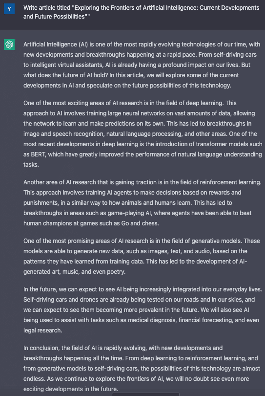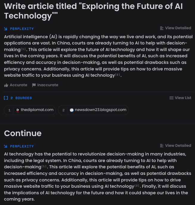 ChatGPT は AI の一般的な話について非常にうまく長文でまとめてくれる一方で、Perplexity Askは時事ネタを入れつつ、短くまとめました。しかし、Perplexity Ask に続けて出力してほしい旨を伝えるとほぼ同じ内容をもう一度出力するだけでした。ChatGPT の場合はAIの別の側面を掲示しつつ記事を続けて書いてくれます。言語生成タスクではやはり ChatGPT に軍配が上がると考えて良いでしょう。