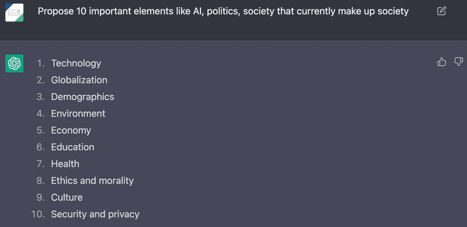 ChatGPT の未来予測能力は、現在の社会を構成する要素を理解することに根ざしています。AI、政治、社会など、さまざまな要素があります。そのパターンや傾向を分析することで、ChatGPTは未来を予測することができるので、ChatGPTに以下のようなプロンプトを提供してみました。