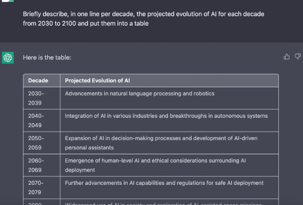 さらに、ChatGPTに「2030年から2100年までの各年代におけるAIの進化予測を10年ごとに1行で簡潔に述べてください」と依頼したところ、予想される進歩の概要を示す明確で簡潔な表が返ってきました。