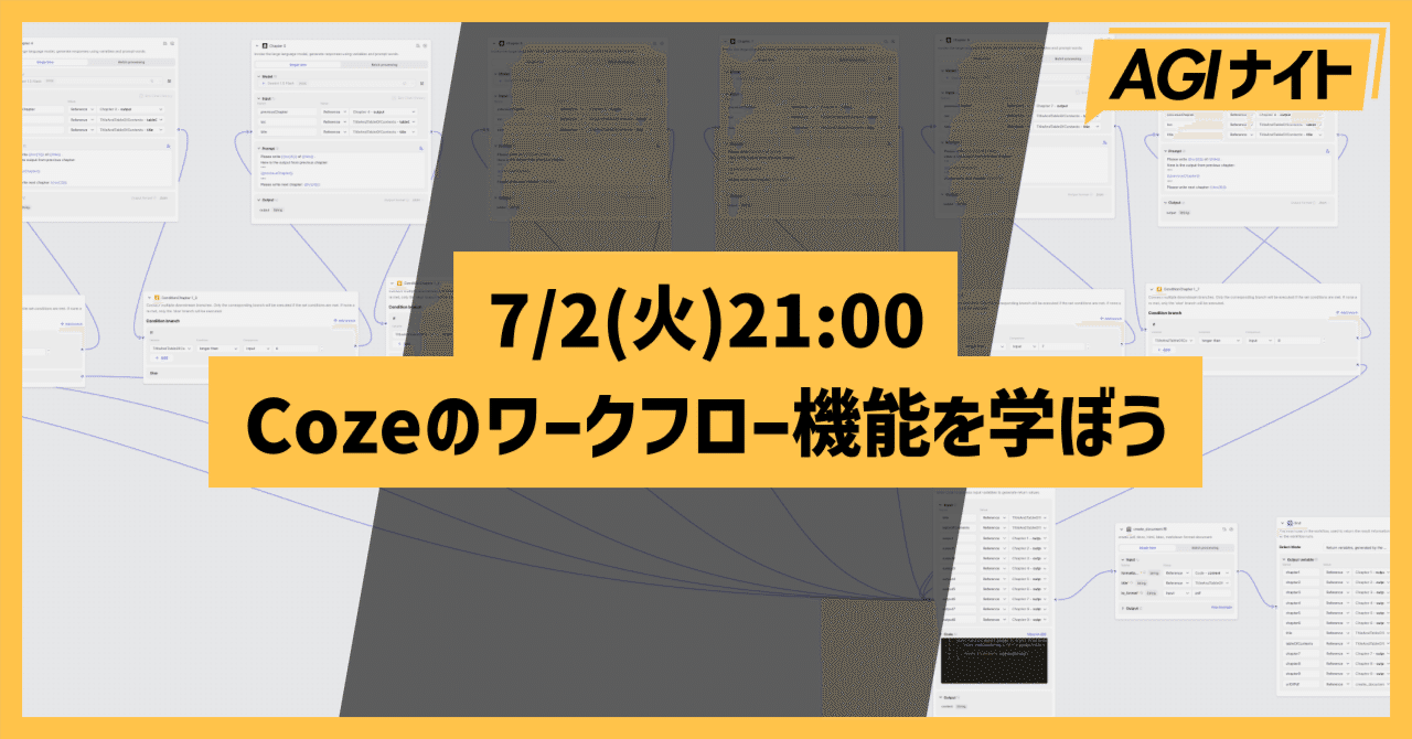 【7/2(火)21:00~】Cozeのワークフロー機能を学ぼう - AGI Night#Coze#イベント#自動化【7/2(火)21:00~】Cozeのワークフロー機能を学ぼう - AGI Night2024-07-02