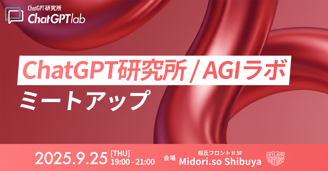 ChatGPT研究所 / AGIラボ オフラインミートアップ @MIDORI.so Shibuya 9/25(木) 開催決定!#ChatGPT#イベント#ニュースChatGPT研究所 / AGIラボ オフラインミートアップ @MIDORI.so Shibuya 9/25(木) 開催決定!2025-09-14
